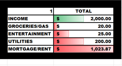 • Income vs. expenses breakdown• Categories for your fixed, variable, and discretionary expenses• Savings and debt repayment sections• Visual summaries with bar graph