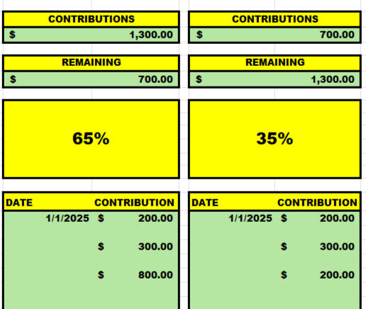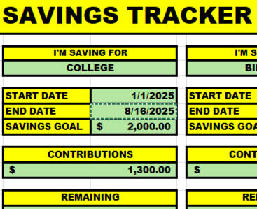 • Goals for your emergency funds or large purchases.• Your progress bars for milestones• Automated formulas to calculate how your monthly contributions impact the timeline.